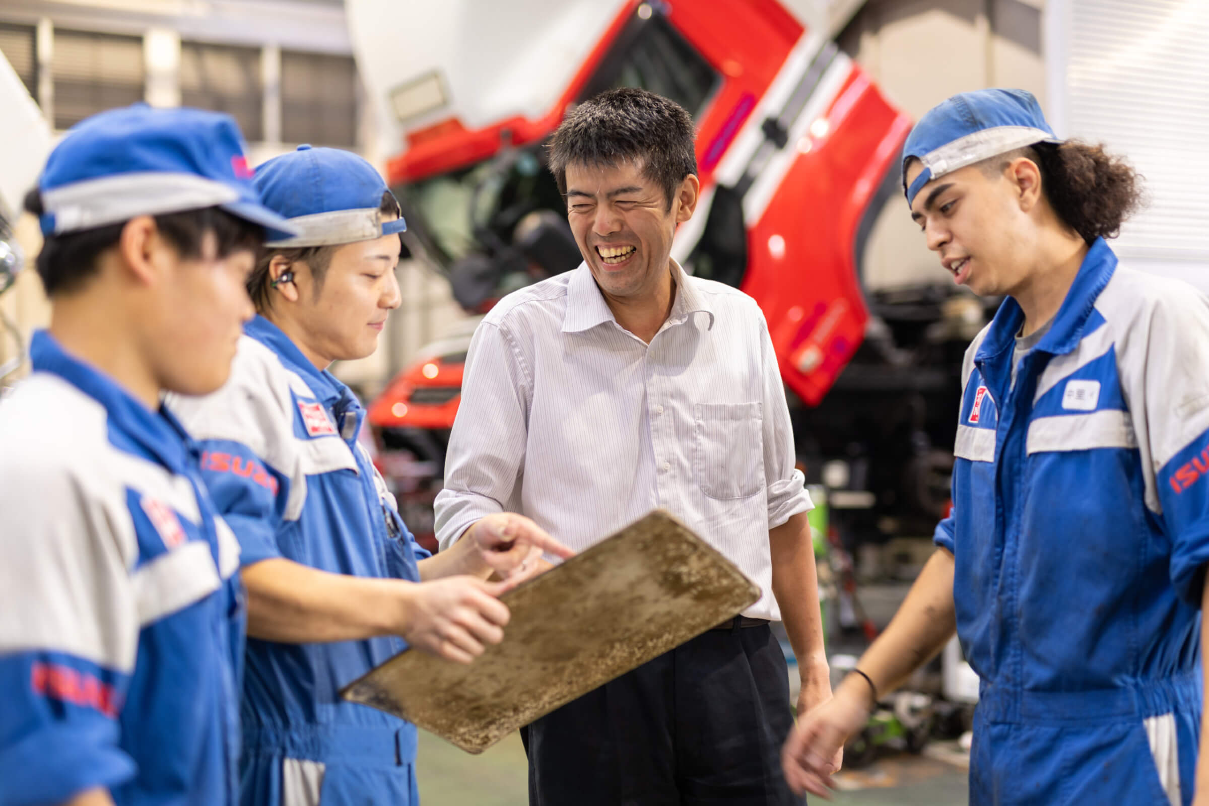 角尾さん:覚悟のうえで挑戦したものの、予想をはるかに超えて大変でした。好きな自動車の知識を活かせると思いきや、まったく歯が立たなかった。自動車とトラックは似て非なるもの。構造も部品も違うので、その一つひとつを覚えることからスタートしなければならず、毎日必死でしたね。だからこそ、職場の雰囲気の良さは救いになりました。年上はもちろん年下の先輩方も親身になって教えてくださり、本当にありがたかったです。